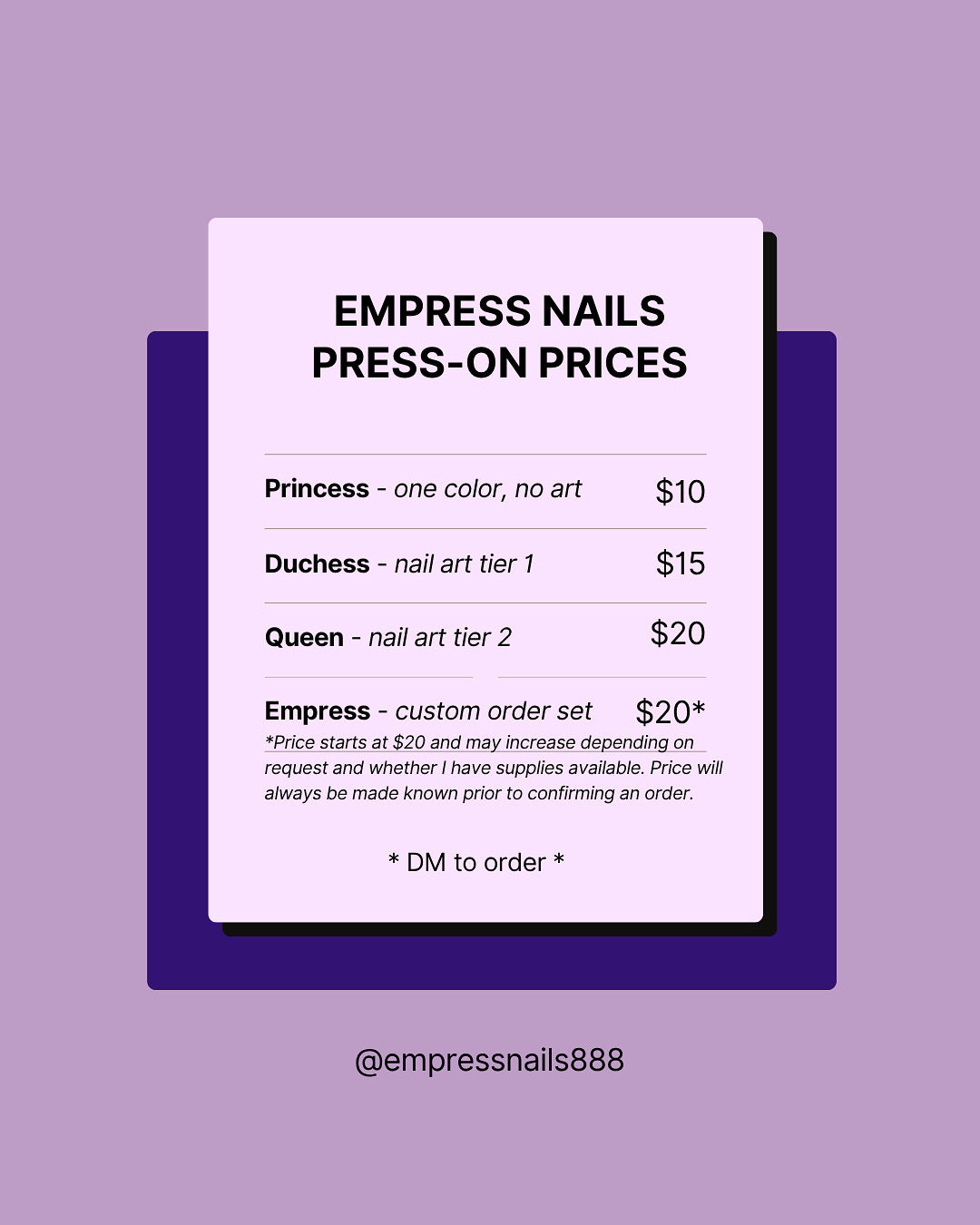 Empress nails are hand-painted press-ons perfect for any occasion. I can’t wait to make you your first set! <3